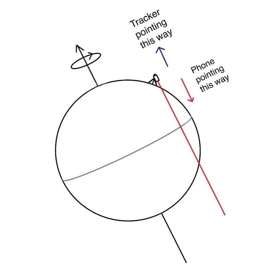 This means that we do have the odd experience of aligning the tracker not using something in the sky above us, but through the earth at our feet. We end up with the phone polar aligning with the opposite pole, and the tracker pointing at your local pole. But that's fine because everything is parallel to the earths axis of rotation and the tracker can now counteract that movement resulting in fixed stars.