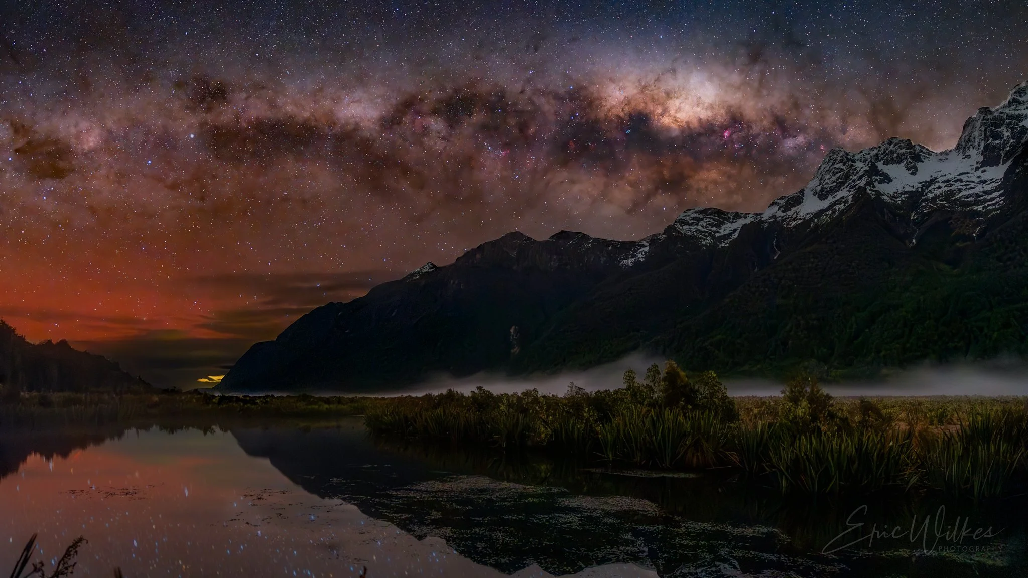 Mirror lakes in Fiordland National Park, Canon RP(astro-mod), RF20mm F1.4 VCM Sky ISO 3200, f/2.0, 10seconds, 3 shot pano. foreground ISO 3200, f/2.0, 60 sec, 3 shot pan pano